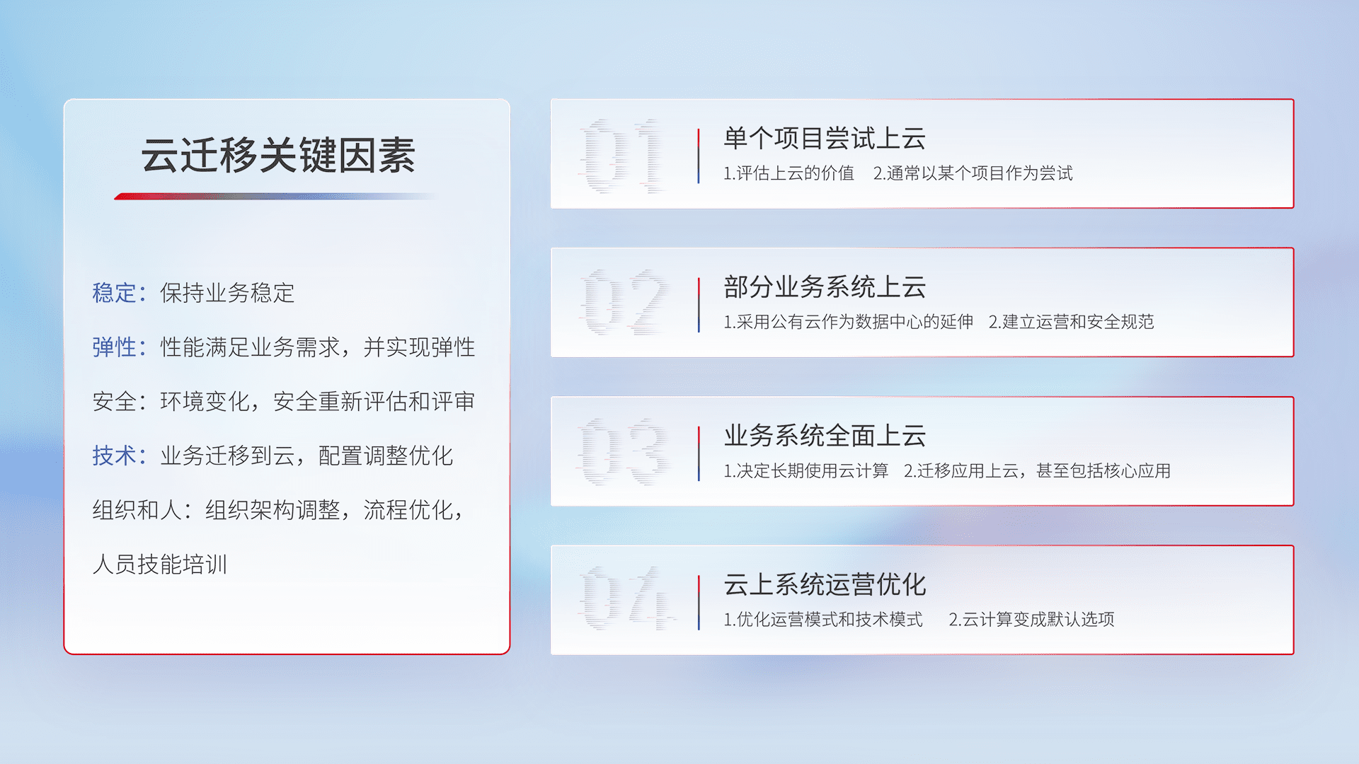 结合实际业务,,,从规划设计、、、、云平台选型、、、、云原生改造、、数据迁移、、、、集成交付,,迁移全过程为客户识别最佳上云路径,,,做好风险识别管理,,,设计网络架构、、、身份权限、、安全审计合规、、操作审计、、日志审计、、、监控告警策略、、多站点容灾设计等,,,对云上基础设施进行整体规划,,,,提升IT治理水平,,,,以满足弹性、、、、高可用、、、、高性能的需求。。