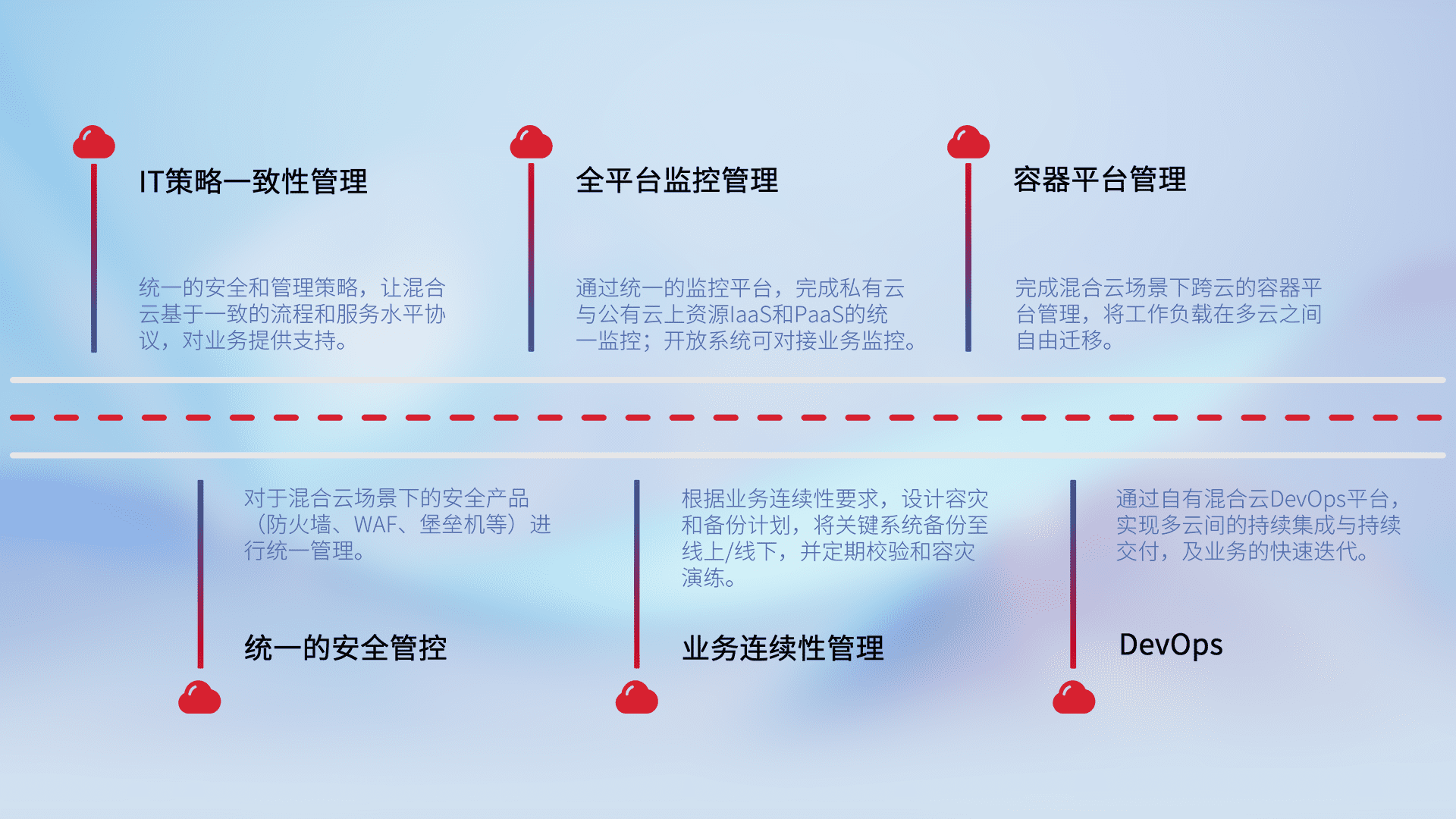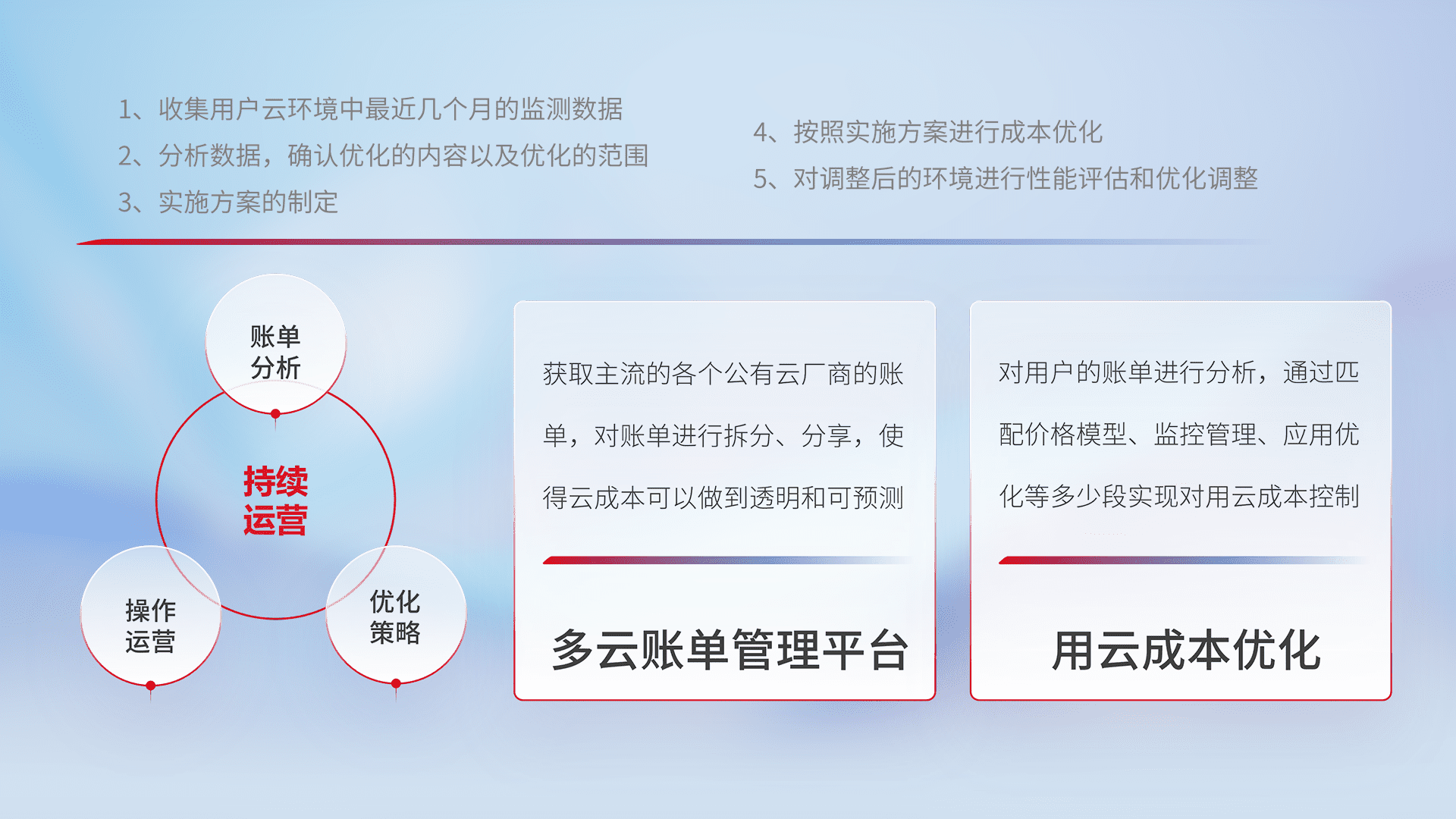 通过多云纳管,,以统一的资源数据模型把客户的云资源进行抽象和封装,,,,进而实现对多云资源的统一操作,,,保障云资源管理的可靠性、、稳定性与可用性。。。量身定制化运维内容,,配置、、、、开发运维、、补丁管理、、、、备份、、、监控、、认证和访问管理、、审计和日常巡检等,,,,保障在用云过程中的可靠度,,,稳定度以及高可用率。。。。