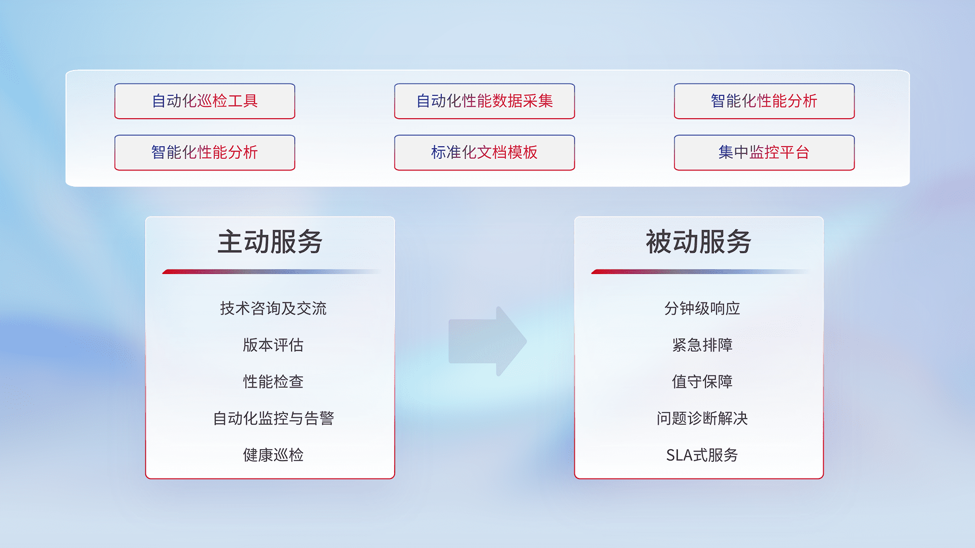 智能化工具和标准化文档,,,保障服务质量,,,,提供主动服务(包含技术咨询、、、、版本评估、、、、性能检查、、、、自动化监控与告警、、、健康巡检)和被动服务包含(分钟级响应、、、紧急排障、、值守保障、、、问题诊断解决、、SLA服务)。。